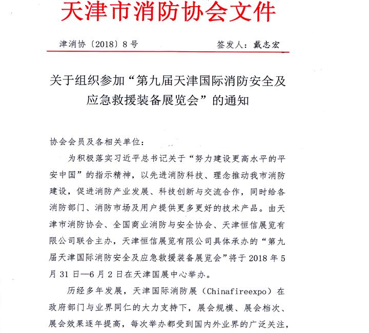 天津市消防協(xié)會-關(guān)于主辦2018第九屆天津消防展的通知