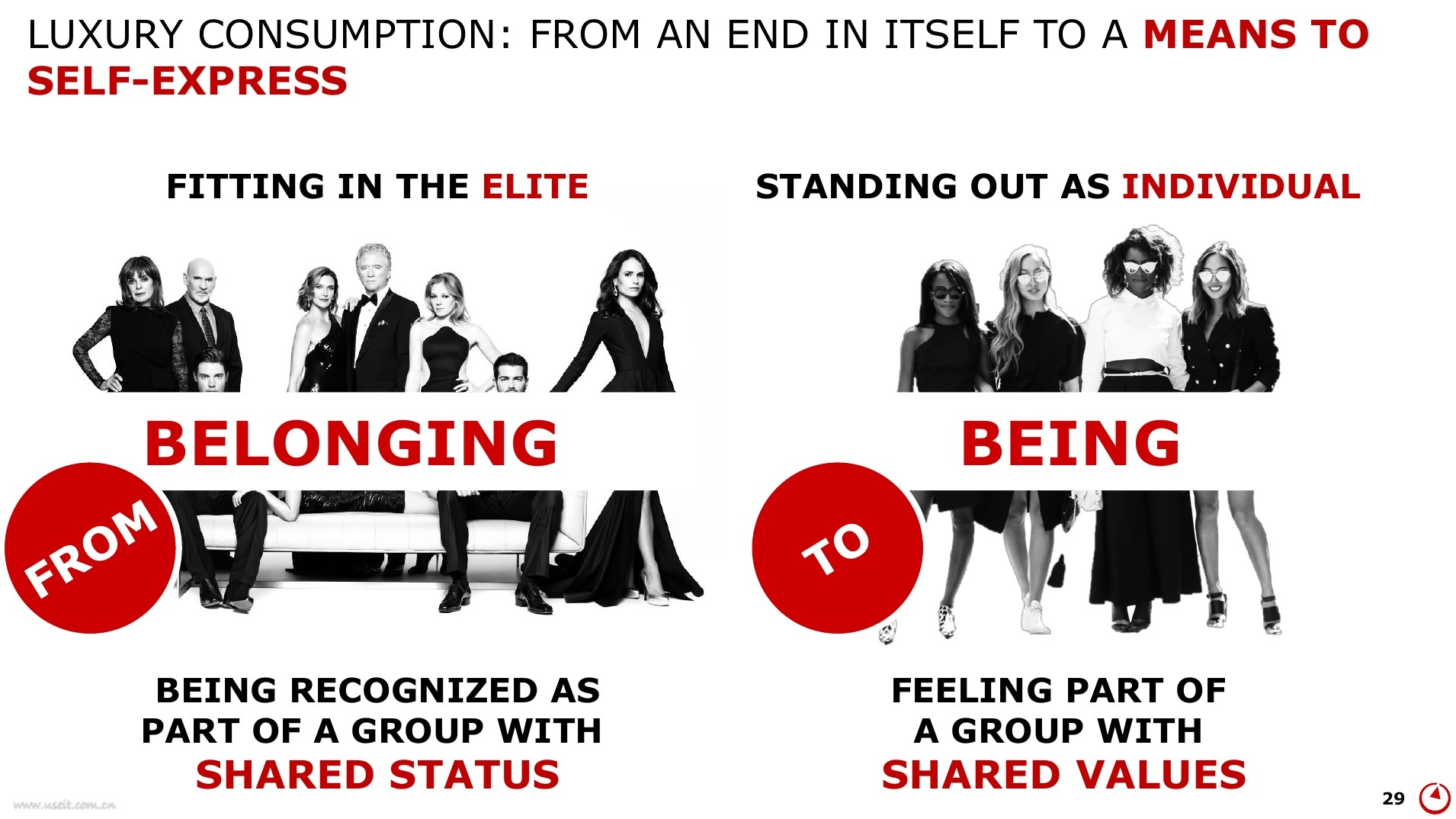 不同于上幾代購買者的炫耀性消費(fèi),伴隨互聯(lián)網(wǎng)和數(shù)字化的發(fā)展,千禧一代天然對(duì)奢侈品的認(rèn)知度高,有自己對(duì)品牌的理解和對(duì)時(shí)尚的看法。“時(shí)尚”、“新潮”、“個(gè)性化”、“當(dāng)季“是對(duì)奢侈品應(yīng)被賦予全新定義。諸多奢侈品牌為適宜消費(fèi)人群的轉(zhuǎn)變,對(duì)自身品牌進(jìn)行重新定位。奢侈品市場(chǎng)逐漸也向多元化、多樣化、個(gè)性化的方向發(fā)展。