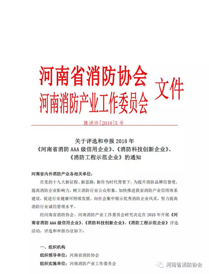 關(guān)于評(píng)選和申報(bào)2018年 《河南省消防AAA級(jí)信用企業(yè)》、《消防科技創(chuàng)新企業(yè)》、 《消防工程示范企業(yè)》的通知
