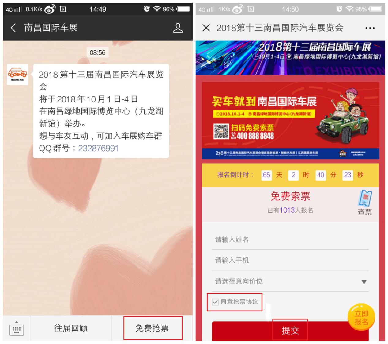 另外本屆南昌國(guó)際車展的免費(fèi)搶票福利已全面上線。只需微信關(guān)注“南昌國(guó)際車展”,點(diǎn)擊菜單欄【免費(fèi)搶票】進(jìn)入頁(yè)面提交信息即可。