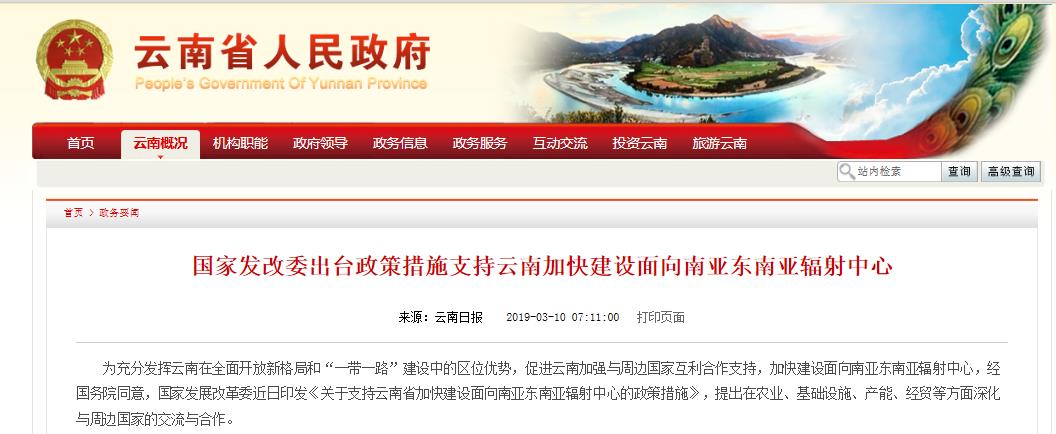 為充分發(fā)揮云南在全面開放新格局和“一帶一路”建設(shè)中的區(qū)位優(yōu)勢,促進(jìn)云南加強(qiáng)與周邊國家互利合作支持,加快建設(shè)面向南亞東南亞輻射中心,經(jīng)國務(wù)院同意,國家發(fā)展改革委近日印發(fā)《關(guān)于支持云南省加快建設(shè)面向南亞東南亞輻射中心的政策措施》,提出在基礎(chǔ)設(shè)施、產(chǎn)能、經(jīng)貿(mào)等方面深化與周邊國家的交流與合作,支持云南建設(shè)海外倉、境外展銷中心、國際快件監(jiān)管中心;推進(jìn)瀾滄江-湄公河等跨境經(jīng)濟(jì)合作,務(wù)實(shí)推進(jìn)中緬、中越、中老跨境經(jīng)濟(jì)合作區(qū)建設(shè)。