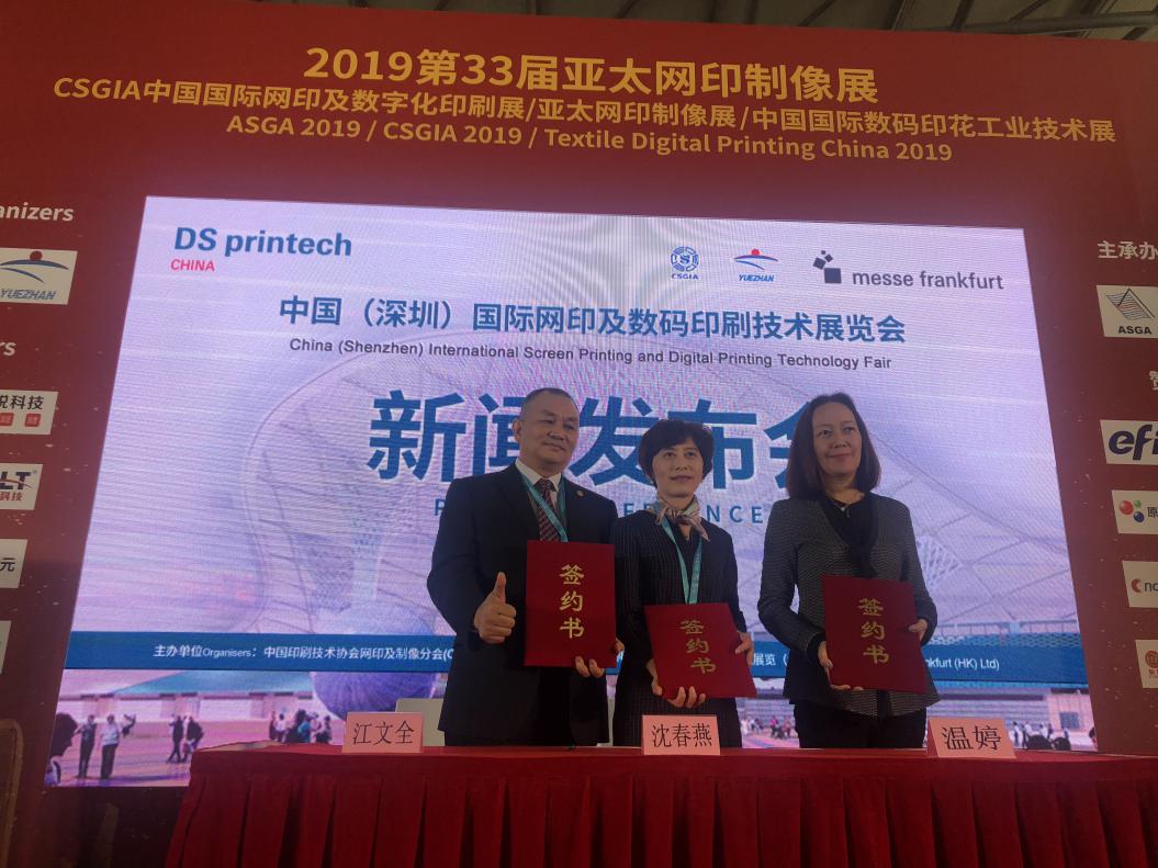 法蘭克福展覽(香港)有限公司、中國印刷技術(shù)協(xié)會網(wǎng)印及制像分會(CSGIA)及廣州市特印展覽服務(wù)有限公司(特印展覽)在今天(10月30日)于上海的合作協(xié)議簽訂儀式中宣布合作舉辦中國(深圳)國際網(wǎng)印及數(shù)碼印刷技術(shù)展覽會(下稱:DS Printech China)。DS Printech China是由CSGIA及特印展覽所擁有超過30年歷史的展會——中國國際網(wǎng)印及數(shù)字化印刷展及同期展會中國國際數(shù)碼印花工業(yè)技術(shù)展優(yōu)化整合而成,并將于2020年10月從廣州移師深圳國際會展中心舉行。