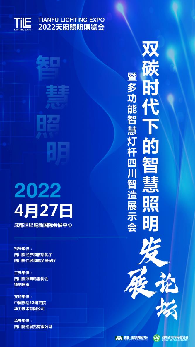 為促進(jìn)雙碳經(jīng)濟(jì)下智慧照明產(chǎn)業(yè)的發(fā)展,推動(dòng)智慧燈桿等照明產(chǎn)品節(jié)能減排技術(shù)的創(chuàng)新和應(yīng)用,用城市之光創(chuàng)造經(jīng)濟(jì)和社會(huì)價(jià)值,2022年4月27-29日,四川省照明電器協(xié)會(huì)、四川德納展覽有限公司將在2022天府照明博覽會(huì)現(xiàn)場(chǎng)聯(lián)合主辦【雙碳時(shí)代下的智慧照明發(fā)展論壇暨多功能智慧燈桿四川智造展示會(huì)】。